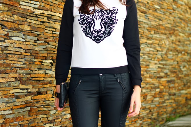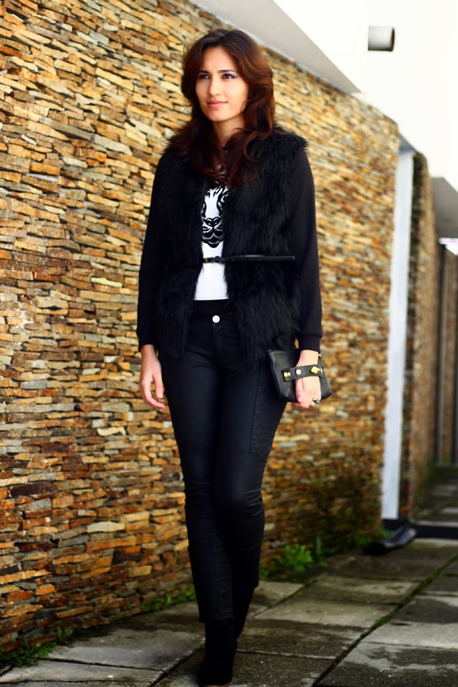 I’m wearing a faux fur vest, which is now a trend, a sweater with a leather detail on the shoulders and my favorite leather pants from Zara. To finalize, I matched this look with a leather clutch from CarmoxPoise (portuguese brand) and my mango’s ankle boots.