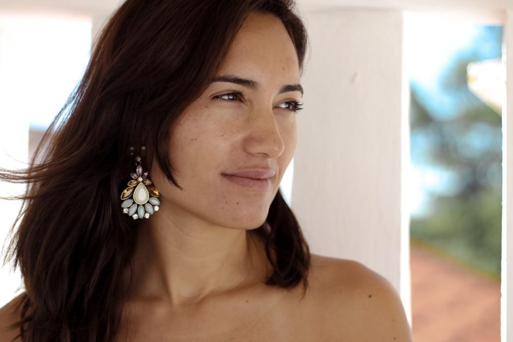 Eu combinei o vestido com estas sandálias rasas num tom avelã e acessorizei com uns brincos esplendorosos.