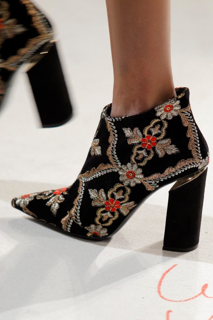 De base aveludada, a singularidade do material está presente no padrão floral das ornamentações em vermelho e dourado que remetem para a ousadia e monumentalidade que inspiraram o inverno de Luis Onofre.