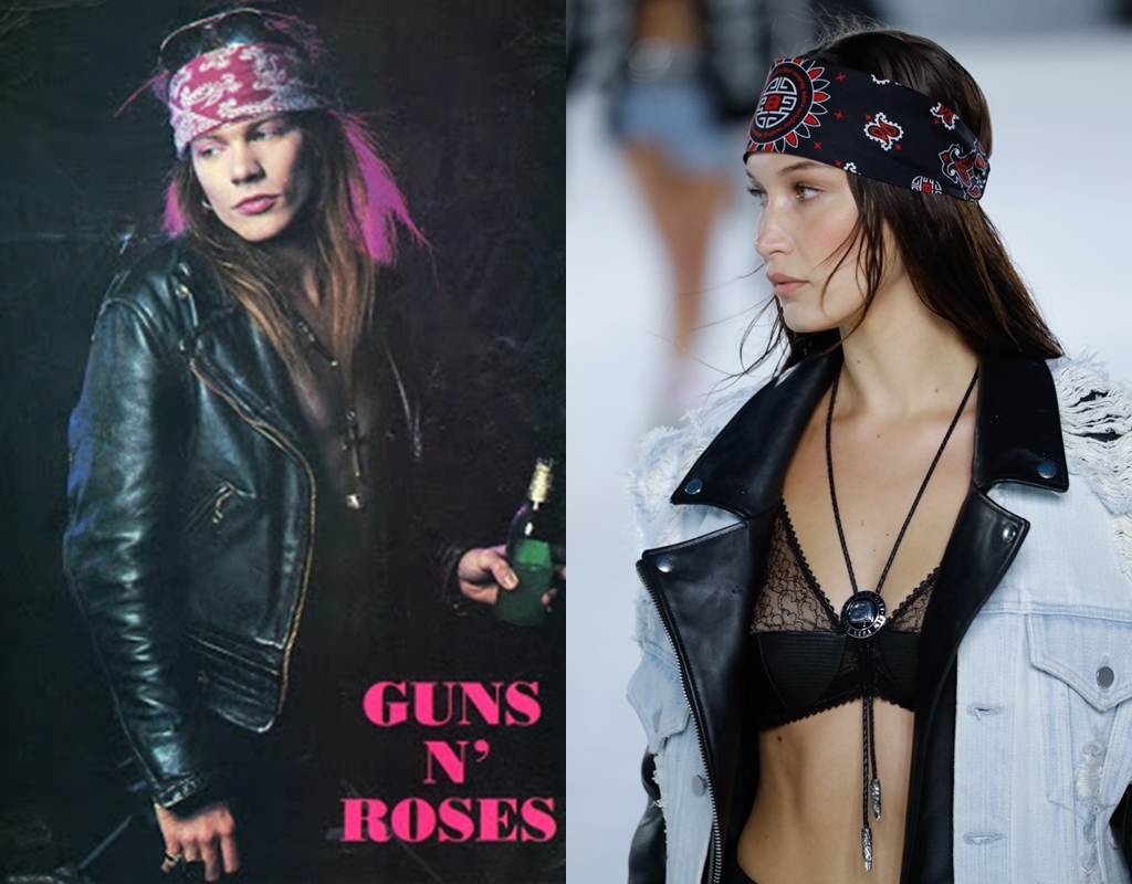 Bandanas, biker jackets, atitude e rock’n’roll são os ingredientes principais na nova coleção primavera-verão do designer de moda Alexander Wang. Digam lá que a Kaia Gerber não parece o Axl Rose do final dos anos 80 início dos 90? Vivi a minha pré-adolescência no auge dos Guns N’ Roses e da MTV (vá lá não fiquem invejosos!) e fiquei muito entusiasmada por ver que Alexander Wang, um dos meus designers de eleição, inspirou-se não só nas suas raízes imigrantes (Tailândes-Americano) mas também no estilo desta grande lenda. Como já disse aqui a sua imagem de marca com a bandana e os seus magníficos casacos de cabedal serão sempre uma inspiração para a moda. Axl Rose tem o seu estilo único. Uma lenda e um grande ícone de moda.